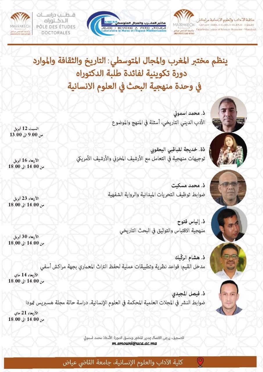 ينظم مختبر “المغرب والمجال المتوسطي: التاريخ والثقافة والموارد”، من 12 أبريل إلى 21 ماي المقبل بكلية الآداب والعلوم الإنسانية بجامعة القاضي عياض، دورة تكوينية لفائدة طلبة الدكتوراه، بهدف تمكين الباحثين من أدوات منهجية حديثة في مجال البحث العلمي بالعلوم الإنسانية، وذلك عبر سلسلة من المحاضرات والورشات التفاعلية التي سيؤطرها نخبة من الأساتذة الجامعيين المتخصصين.
