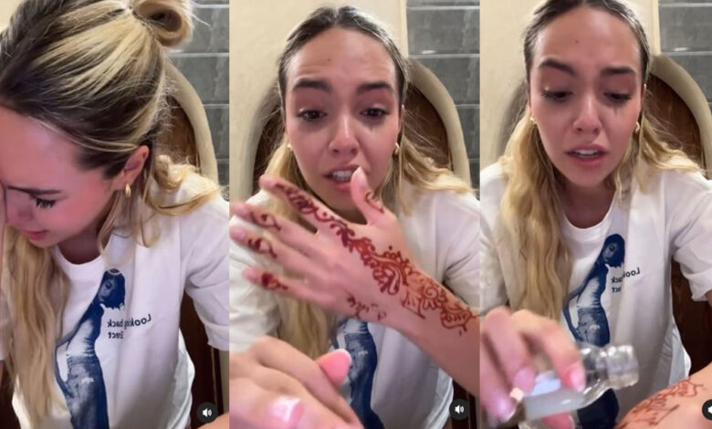 ويوثق الفيديو كيف أمسكت الشابة بقنينة تحتوي على سائل، وسكبته على يدها في محاولة لطمس معالم الحناء، وهي تتساءل بحسرة عن الطريقة التي ستتخلص بها من هذا الرسم قبل العودة إلى الديار الإسبانية، لاسيما وأن الحناء المستعمل من طرف بعض النقاشات يسبب حساسية للبشرة، بفعل خلطه بمواد مثل “الدوليو”. .