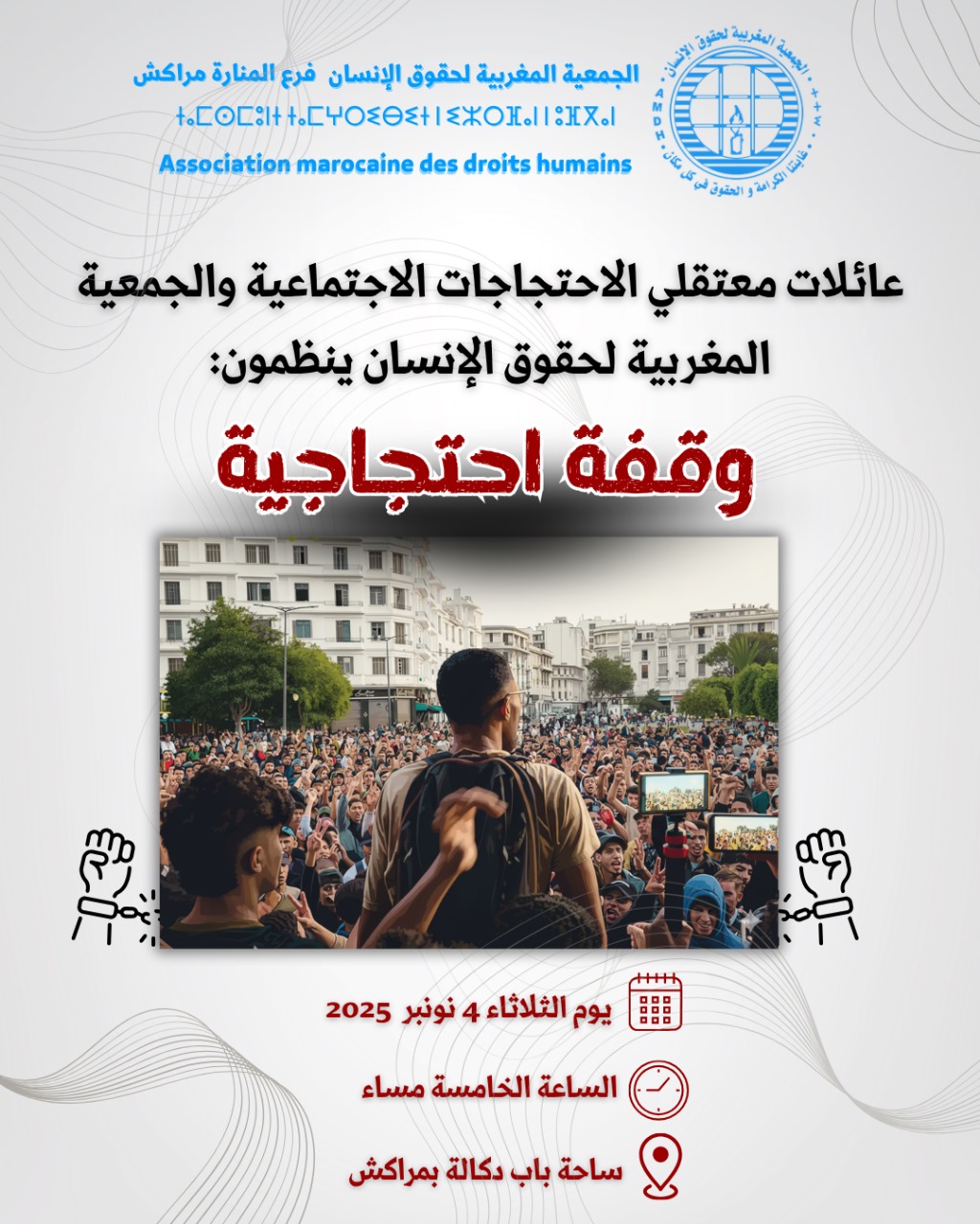 أعلنت الجمعية المغربية لحقوق الإنسان فرع المنارة مراكش، بتنسيق مع عائلات معتقلي الاحتجاجات الاجتماعية، عن تنظيم وقفة احتجاجية يوم الثلاثاء 4 نونبر 2025 على الساعة الخامسة مساء بساحة باب دكالة مراكش.