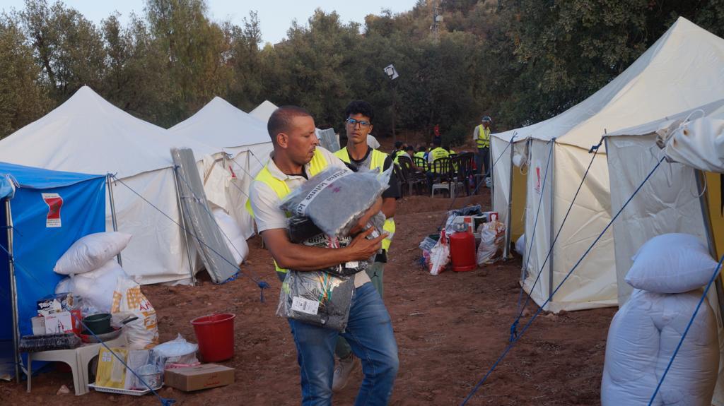 بدأ المتطوعون بمعية بعض الشباب من المنطقة ينصبون الخيام بطريقة بديعة و يجهزونها بكل المستلزمات المذكورة أعلاه، ليبدأ بعد ذلك توزيع الخيام على الأسر، و في حديثنا مع السيد محمد الدقاق رئيس الجمعية و المشرف على القافلة أكد أن عملية دعم و مساعدات الأسر المنكوبة لازالت مستمرة حيث قال:” لقد بلغنا الأهداف التي سطرناها منذ الإعلان عن زلزال الحوز حيث نصبنا لحد الساعة ما يزيد عن 600 خيمة بـ 19 مخيما تتوزع على كل المناطق المنكوبة بإقليم الحوز للاستفادة من هذه المبادرة الإنسانية .”