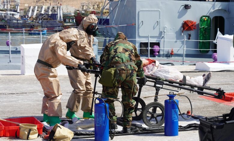 في إطار التعاون العسكري المغربي الأمريكي في تدبير الكوارث، جرت الثلاثاء بميناء أكادير العسكري، مناورات للحد من أسلحة الدمار الشامل.