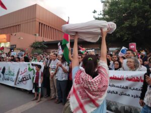 وانتهت المسيرة بكلمة الجبهة المغربية لدعم فلسطين ومناهضة التطبيع والتي ركزت على إدانة محرقة رفح وجرائم الإبادة والدعوة لتعميق المقاطعة و وقف كل أشكال التطبيع مع الكيان الصهيوني، والعدول عن مهرجان موازين ومقاطعته.