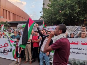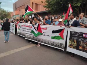 نظمت الجبهة المغربية لدعم فلسطين ومناهضة التطبيع بمراكش، مساء أمس الثلاثاء 28 ماي الجاري، وقفة احتجاجية بساحة البريد بجليز، تحولت إلى مسيرة حاشدة في اتجاه نافورة البردعي عبر شارع محمد الخامس.