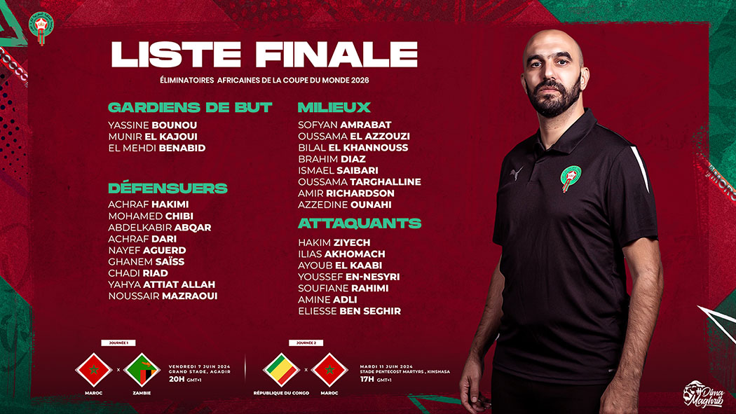 وتدخل هاتان المباراتان اللتان ستخوضهما النخبة الوطنية امام منتخبي زامبيا بالملعب الكبير بأكادير يوم الجمعة 7 يونيو 2024 ، بداية من الساعة الثامنة مساء، والكونغو برازافيل يوم الثلاثاء 11 يونيو 2024 بملعب الشهداء، بمدينة كينشاسا بالكونغو الديموقراطية، بداية من الساعة الخامسة عصرا بالتوقيت المحلي، في إطار التصفيات الإفريقية المؤهلة لنهائيات كأس العالم التي ستجرى أطوارها مناصفة ما بين ملاعب الولايات المتحدة الأمريكية؛ المكسيك وكندا.