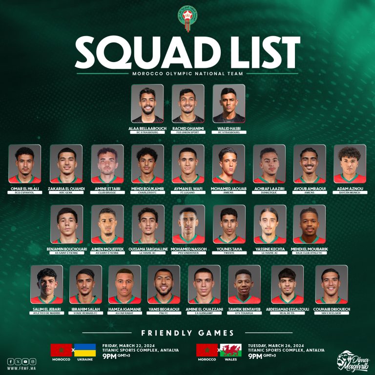 وجه طارق السكتيوي، الدعوة إلى 27 لاعبا استعدادا للمباراتين الوديتين اللتين سيخوضهما المنتخب الوطني الأولمبي، بمدينة أنطاليا بتركيا، أمام منتخبي أوكرانيا و ويلز يوم الجمعة والثلاثاء 22 / 26 مارس 2024 .