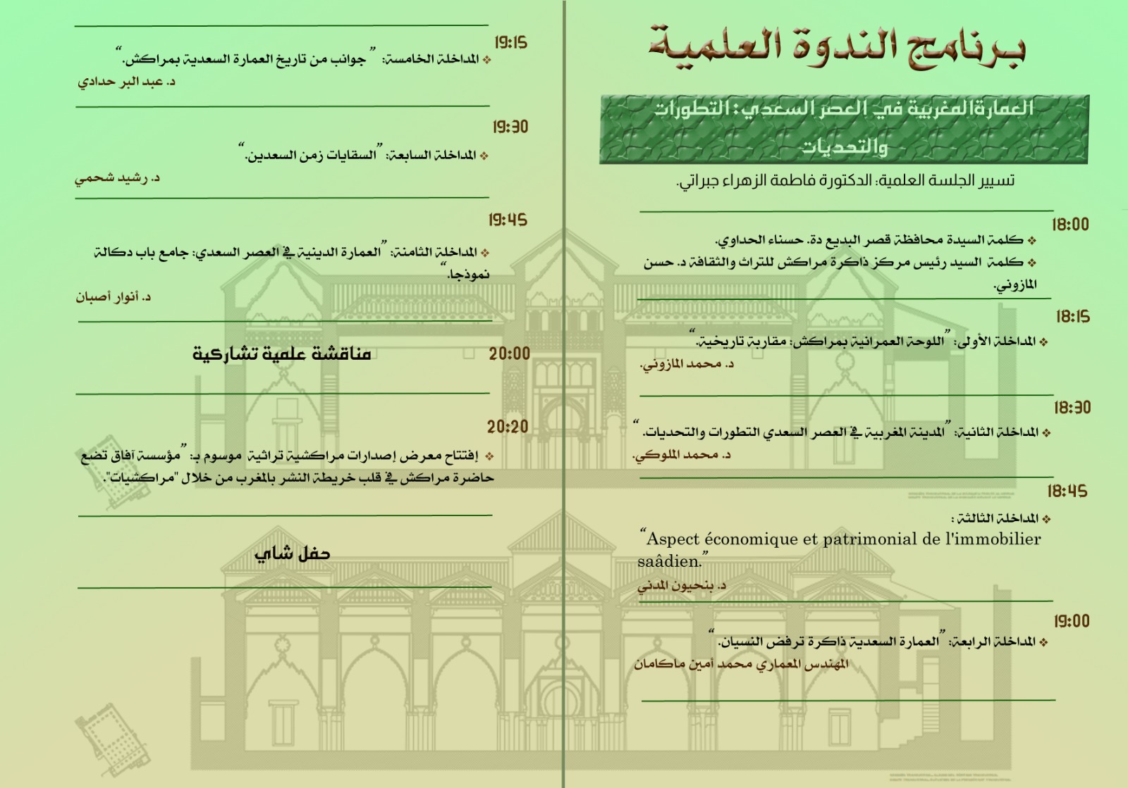 تنظم محافظة قصر البديع ومركز ذاكرة مراكش للتراث والثقافة بشراكة مع مؤسسة آفاق للدراسات والنشر والاتصال، ندوة علمية تحت عنوان “العمارة المغربية في العصر السعدي: التطورات والتحديات”.