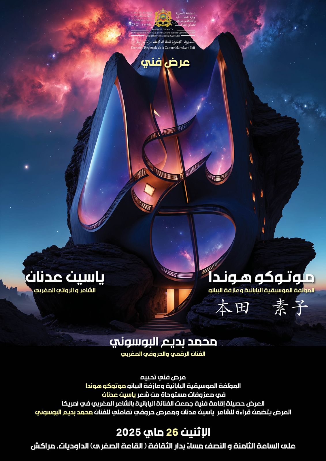 في إطار فعاليات المعرض الجهوي للكتاب بمراكش الذي تنظمه المديرية الجهوية للثقافة لجهة مراكش آسفي تحتضن القاعة الصغرى لدار الثقافة بالداوديات يوم الاثنين 26 ماي 2025 على الساعة الثامنة والنصف مساء عرضا فنيا موسيقيا تُحييه المؤلفة الموسيقية اليابانية موتوكو هوندا التي ستقدم معزوفات موسيقية على البيانو مستوحاة من شعر ياسين عدنان. وإضافة إلى مشاركة ياسين عدنان بقراءات شعرية، سيصاحب هذا الحفل الفني معرض حروفي تفاعلي من إبداع الفنان محمد بديع البوسوني.