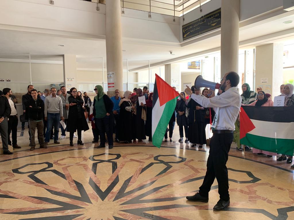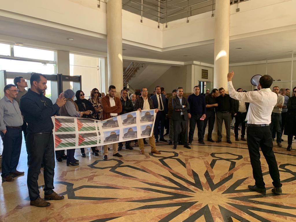 نظم المكتب المحلي للنقابة الديمقراطية للعدل بمراكش العضو بالفدرالية الديمقراطية للشغل، صباح اليوم الثلاثاء 24 أكتوبر الجاري، وقفة احتجاجية ببهو قصر العدالة بسيدي يوسف للتعبير عن تضامنه مع الشعب الفسلطيني.