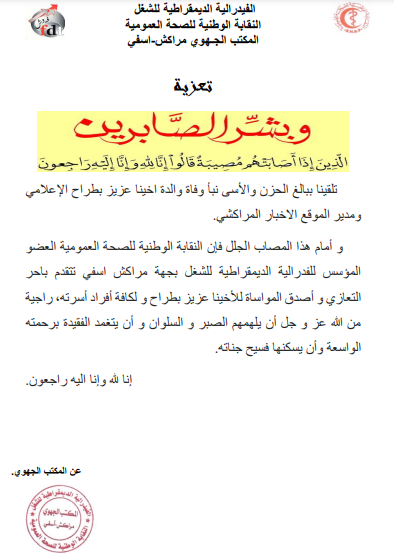 تلقينا ببالغ الحزن والأسى نبأ وفاة والدة أخينا عزيز بطراح الإعلامي ومدير الموقع الإخباري “المراكشي”، و أمام هذا المصاب الجلل فإن النقابة الوطنية للصحة العمومية العضو المؤسس للفدرالية الديمقراطية للشغل بجهة مراكش أسفي، تتقدم بأحر التعازي و أصدق المواساة لأخينا عزيز بطراح و لكافة أفراد أسرته، راجية من الله عز و جل أن يلهمهم الصبر و السلوان و أن يتغمد الفقيدة برحمته الواسعة وأن يسكنها فسيح جناته.