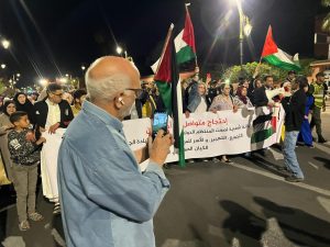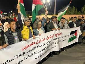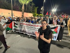ورفع المحتجون المشاركون في المسيرة التي جابت شارع محمد الخامس انطلاقا من ساحة مسجد الكتبية، شعارات تندد بالحصار والتجويع والتقتيل الذي يتعرض له الشعب الفلسطيني في قطاع غزة منذ أشهر، كما صدحت حناحز المحتجين تدين التطبيع مع اسرائيل.