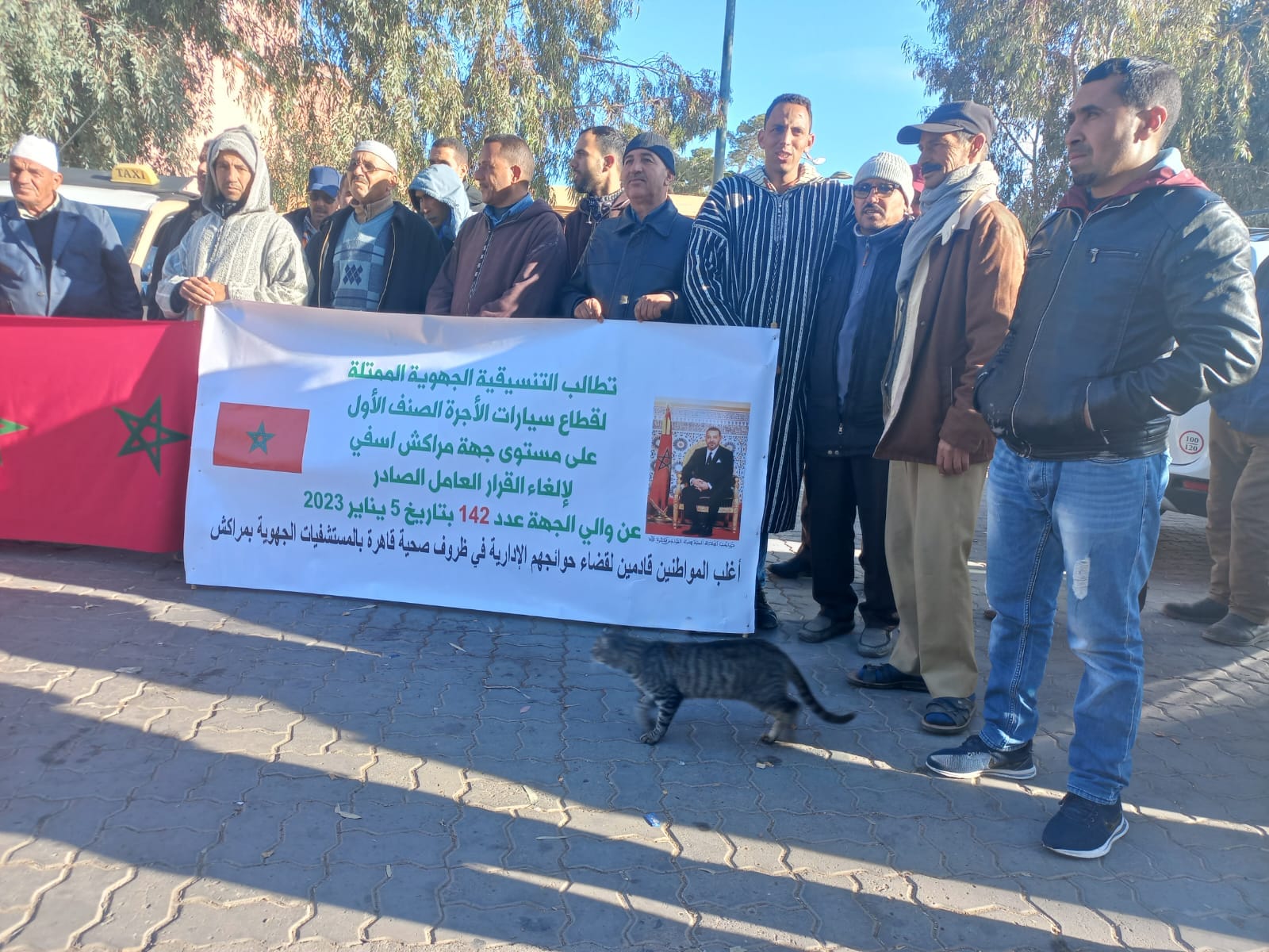 ورفع المتحتجون لافتة يستنكرون من خلالها القرار العاملي الصادر عن والي جهة مراكش آسفي عدد 142 بتاريخ خامس يناير الجاري، مرددين شعارات تطالب بالتراجع عنه والغائه.