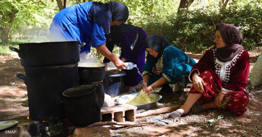 تقول إيجة، في تصريح مماثل، وهي توقد النار في “كانون” ثبتت فوقه بعناية آنية كبيرة لطبخ أكلة الكسكس، “نساء القرية كلهن معروفات بحيويتهن ومثابرتهن، فحتى في الأيام العادية، يحرصن على مساعدة أزواجهن في الحقول وتربية المواشي وكل أشغال البيت”.