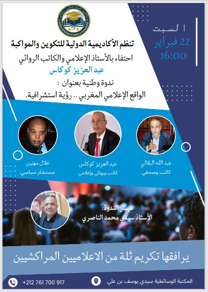 الندوة التي يؤطرها عبد الله البقالي وعلال مهنين، تحتفي بالإعلامي والكاتب عبد العزيز كوكاس من خلال توقيع مجموعة من مؤلفاته، مصحوبة بتكريم ثلة فاضلة من الإعلاميين المراكشيين.