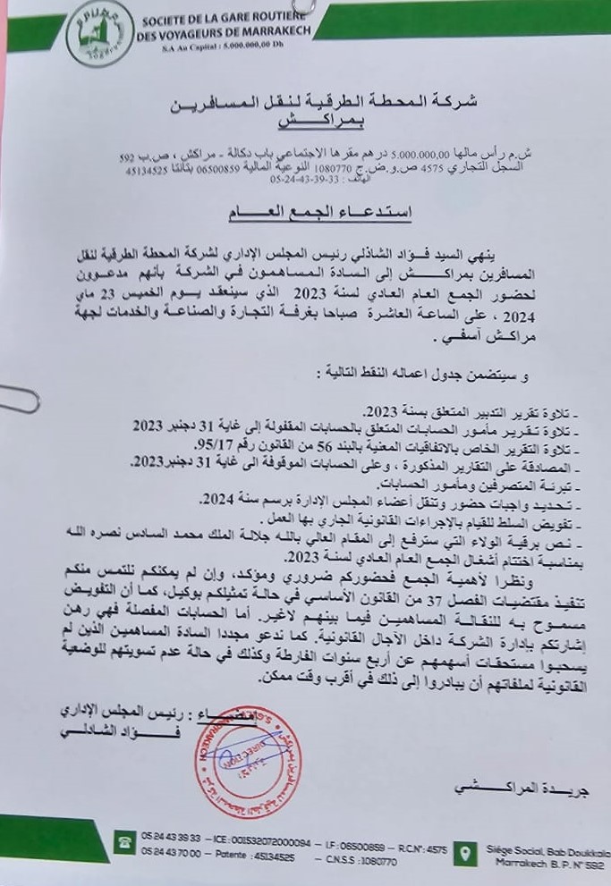 ينهي السيد فؤاد الشاذلي رئيس المجلس الإداري لشركة المحطة الطرقية لنقل المسافرين بمراكش إلى السادة المساهمين في الشركة بأنهم مدعوون لحضور الجمع العام العادي لسنة 2023، والذي سينعقد يوم الخميس 23 ماي 2024، على الساعة العاشرة صباحا بغرفة التجارة والصناعة والخدمات لجهة مراكش آسفي.