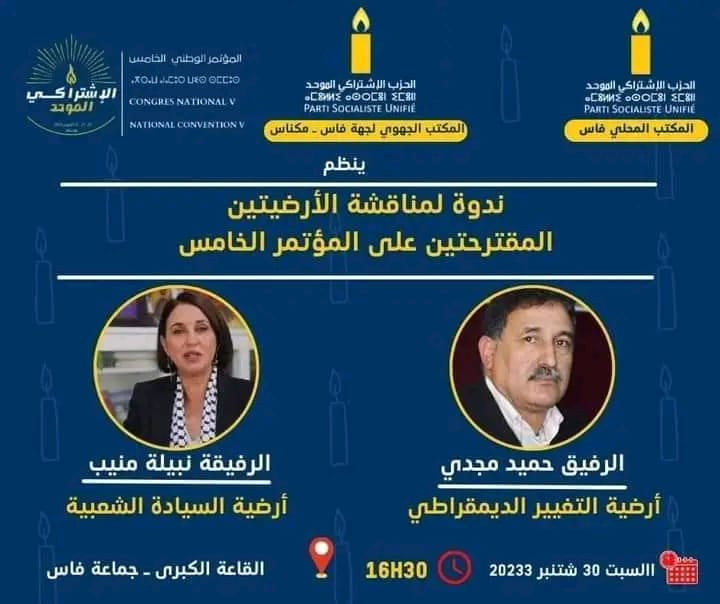 ويشار إلى أن المكتب الجهوي للحزب الإشتراكي الموحد بفاس مكناس، كان قد قرر تنظيم ندوة لمناقشة الأرضيتين المقترحتين على المؤتمر الخامس، حيث كان من المنتظر أن تدافع نبيلة منيب عن أرضية السيادة الشعبية التي تتزعمها أمام منسق أرضية التغيير الديمقراطي، قبل أن يتم تأجيل الندوة بدعوى أن التيار ينتقد قيادة الحزب وفق ما جاء في بلاغ له.
