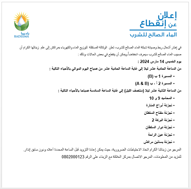 في إطار أشغال ربط وصيانة شبكة الماء الصالح للشرب، تعلن الوكالة المستقلة لتوزيع الماء والكهرباء بمراكش إلى علم زبنائها الكرام أن صبيب الماء الصالح للشرب سيعرف انخفاضاً ويمكن أن ينقطع في بعض الحالات وذلك: