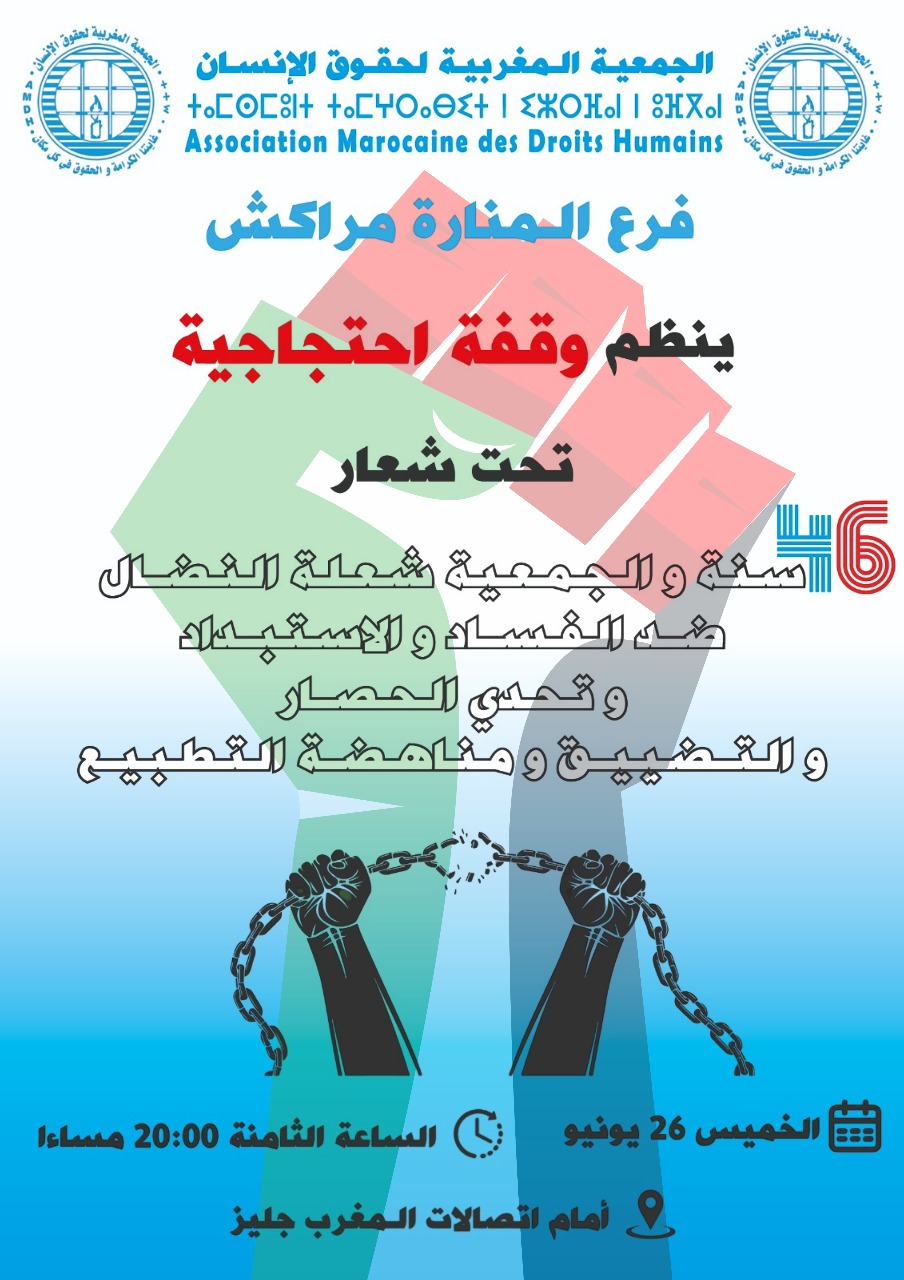 بمناسبة مرور 46 سنة على تأسيسها، ينظم فرع الجمعية المغربية لحقوق الإنسان بالمنارة – مراكش، وقفة احتجاجية يوم غد الخميس 26 يونيو الجاري، على الساعة الثامنة مساء (20:00) أمام مقر اتصالات المغرب بجليز، تحت شعار: