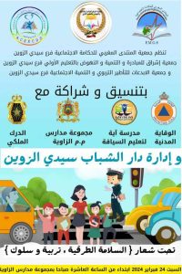 في اطار الإحتفال باليوم الوطني للسلامة الطرقية، نظمت جمعية المنتدى المغربي للحكامة الاجتماعية فرع سيد الزوين، بتنسيق مع جمعية إشراق للمبادرة والتنمية والنهوض بالتعليم الأولي فرع سيد الزوين، وجمعية الإبداعات للتأطير التربوي والتنمية الإجتماعية فرع سيد الزوين، وبشراكة مع مدرسة آية لتعليم السياقة والدرك الملكي والوقاية المدنية والقوات المساعدة، نشاطا تحسيسيا لفائدة تلاميذ مجموعة مدارس الزواية الإبتدائية.