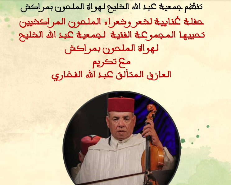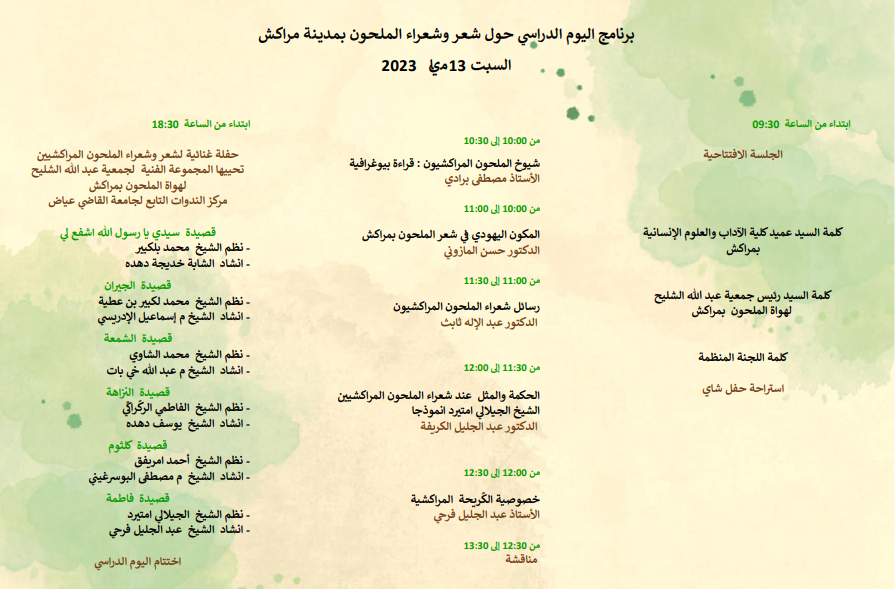 أعلنت جمعية عبد الله الشليح لهواة الملحون بمراكش، عن تنظيم يوم دراسي حول شعر وشعراء الملحون بمراكش، يوم السبت 13 ماي الجاري، بقاعة المحاضرات بكلية الآداب والعلوم الإنسانية، التابعة لجامعة القاضي عياض بمراكش.