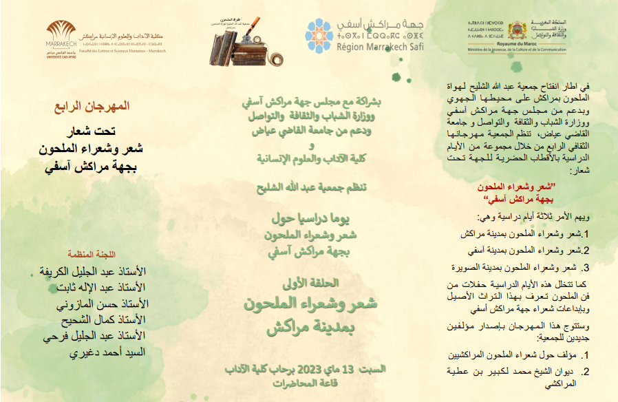 اليوم الدراسي يأتي كحلقة أولى قد تليها حلقات أخرى في قادم الأيام، ينظم من طرف جمعية عبد الله الشليح لهواة الملحون بشراكة مع جهة مراكش أسفي، وبدعم من وزارة الشباب والثقافة والرياضة، وجامعة القاضي عياض مراكش، في إطار مهرجانها الثقافي الرابع.