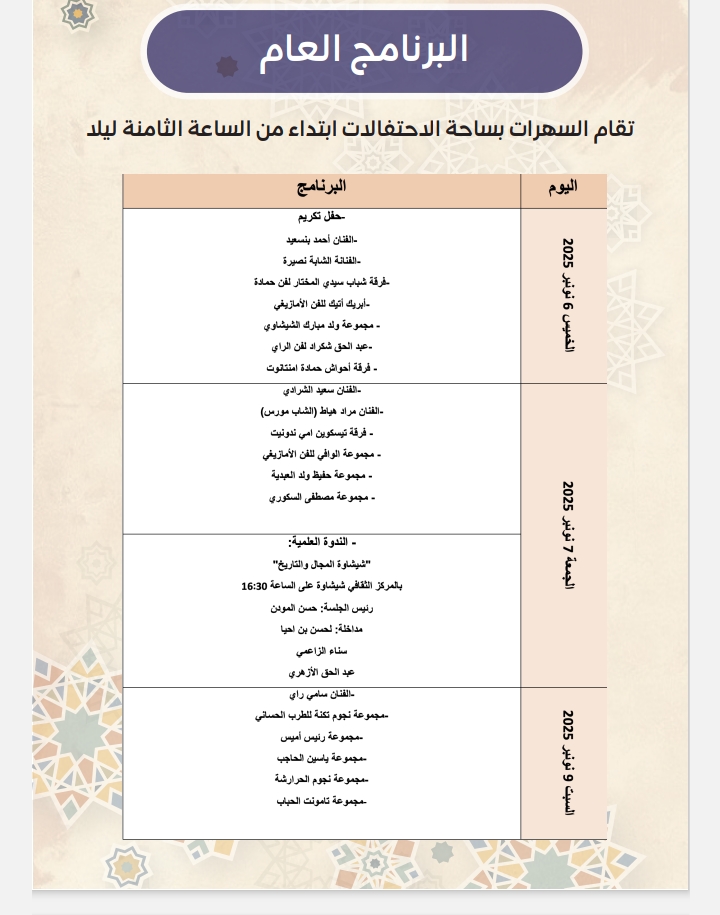 وستتحول ساحة الاحتفالات بمدينة شيشاوة خلال أيام المهرجان إلى فضاء فني كبير يحتضن سهرات موسيقية كبرى تحييها فرق فنية من مختلف جهات المملكة إلى جانب فنانين مرموقين، مما يجعل من المهرجان عرسا ثقافيا وطنيا متنوعا يجمع بين الإبداع الشبابي والاحتفاء بالتراث الموسيقي المغربي.