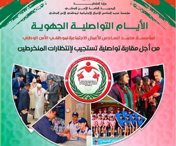 تنظم مؤسسة محمد السادس للأعمال الاجتماعية لموظفي الأمن الوطني، أيام 6 و7 و8 دجنبر الجاري، النسخة الأولى للأيام التواصلية للقرب لفائدة منخرطي المؤسسة من موظفي الأمن الوطني الممارسين والمتقاعدين وكذا أبنائهم وباقي ذوي حقوقهم، وذلك بفضاء خاص تم تجهيزه بالقاعة متعددة الرياضات محمد مجيد بمدينة الدار البيضاء.