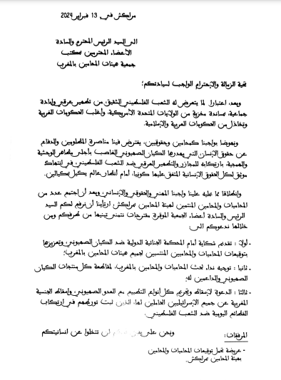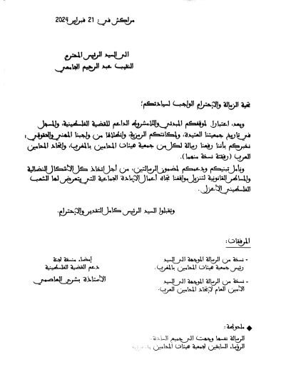 الرسائل التي وقعها حوالي أربعمائة محام ومحامية تلتمس اتخاذ أشكال نضالية نصرة للمقاومة الفلسطينية، وهذا نص الرسائل.