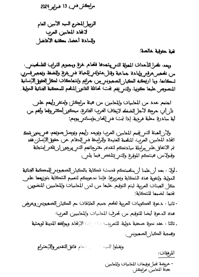 محامون بهيئة مراكش يدعون إلى اتخاذ أشكال نضالية نصرة للمقاومة الفلسطينية