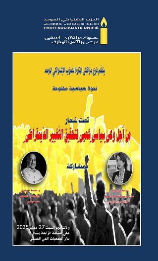 ينظم الحزب الاشتراكي الموحد، فرع مراكش المنارة، ندوة سياسية وفكرية مفتوحة، يؤطرها كل من النائبة البرلمانية الدكتورة نبيلة منيب والحقوقي خالد البكاري، وذلك تحت شعار: «من أجل وعي شعبي لتحقيق التغيير الديمقراطي».