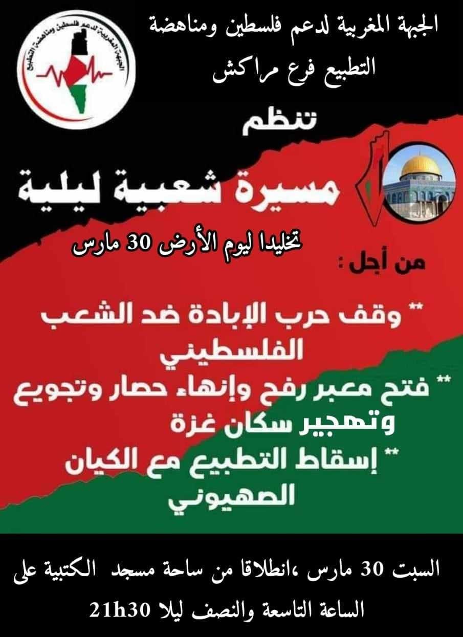 أعلنت الجبهة المغربية لدعم فلسطين ومناهضة التطبيع فرع مراكش، عن تنظيم مسيرة شعبية ليلية تخليدا ليوم الأرض الذي يصادف 30 مارس من كل عام.