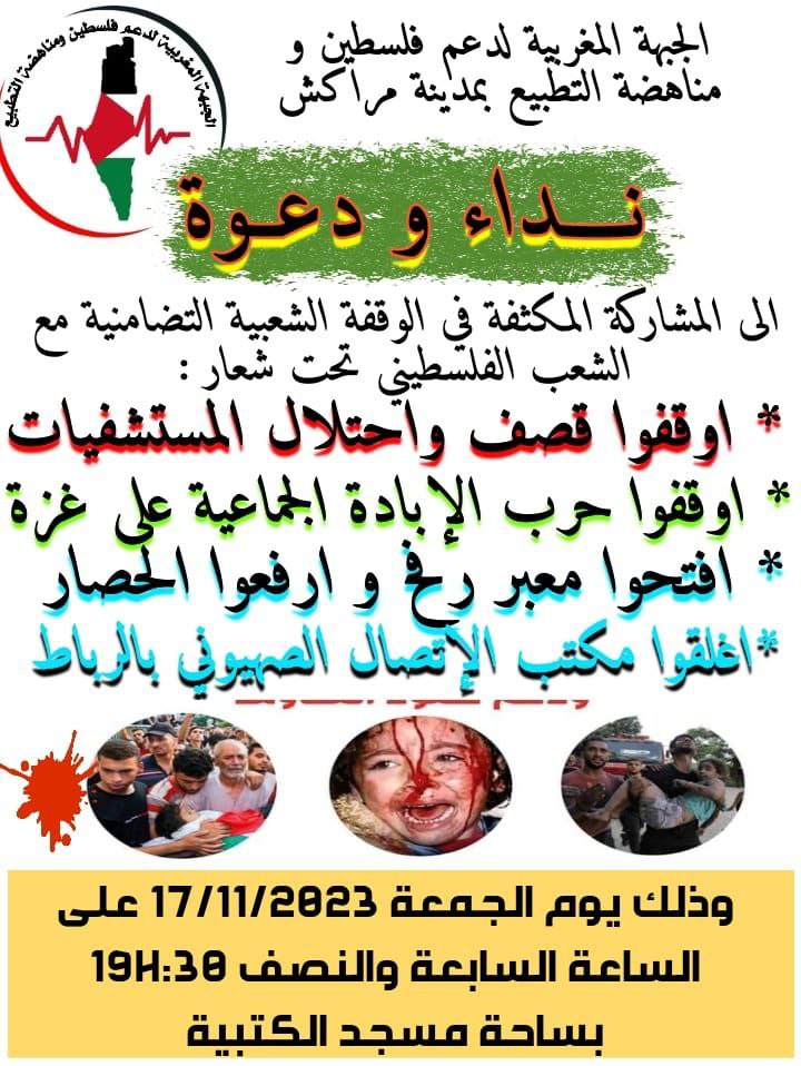 أعلنت السكرتارية المحلية بمراكش للجبهة المغربية لدعم فلسطين ومناهضة التطبيع بمراكش، عن تنظيم وقفة احتجاجية مساء اليوم الجمعة 17 نونبر الجاري، ابتداء من الساعة السابعة والنصف مساء بساحة مسجد الكتبية، تضامنا مع الشعب الفلسطيني.