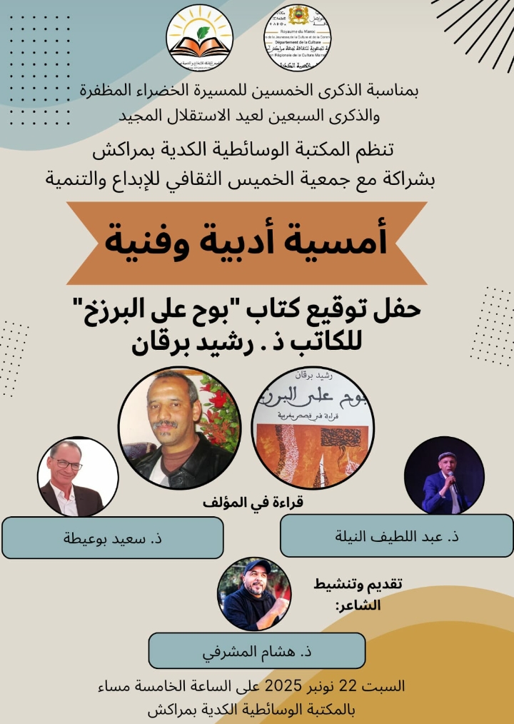 ويتضمن البرنامج أيضا حفل توقيع الإصدار الجديد للدكتور رشيد برقان بعنوان “بوح على البرزخ – قراءات في تجارب قصصية مغربية”، مرفوقا بشهادة أدبية في حق المؤلف يقدّمها الأديب عبد اللطيف النيلة، إضافة إلى قراءة نقدية للأستاذ سعيد بوعيطة.