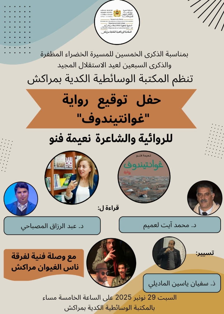 تنظم المكتبة الوسائطية الكدية بمراكش،تحت إشراف المديرية الجهوية لوزارة الشباب والثقافة والتواصل – قطاع الثقافة – مراكش آسفي، حفل توقيع رواية “غواتيندوف” للروائية والشاعرة نعيمة فنو، وذلك يوم غد السبت 29 نونبر 2025 على الساعة الخامسة مساء بقاعة الندوات بالمكتبة.