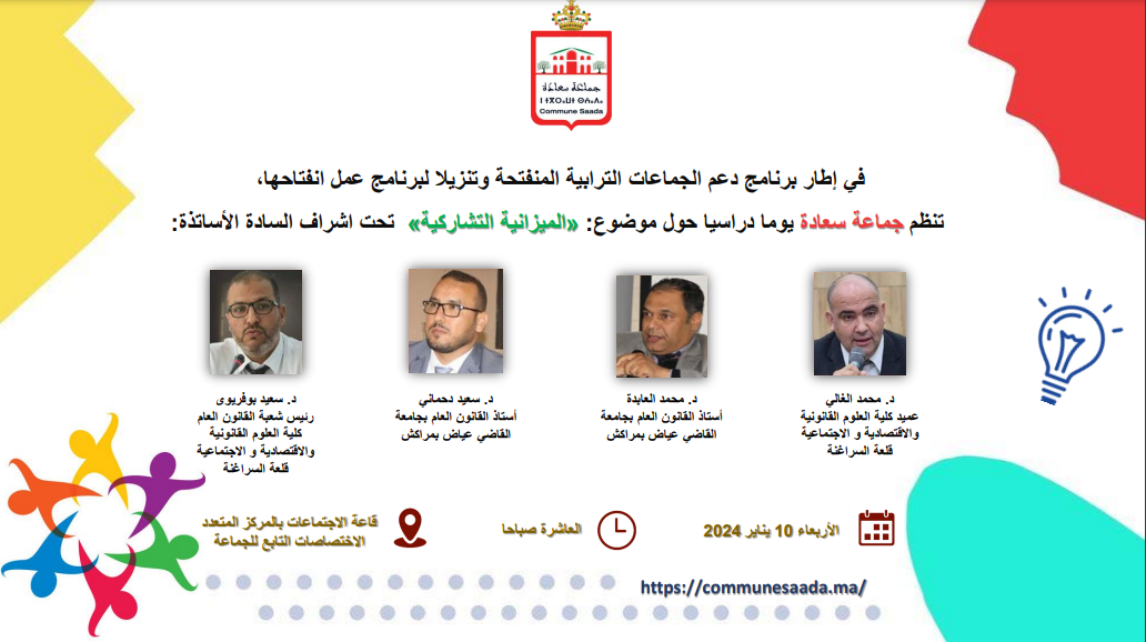 في إطار برنامج دعم الجماعات الترابية المنفتحة وتنزيلا لبرنامج عمل انفتاحها، تنظم جماعة سعادة بعمالة مراكش، غدا الأربعاء عاشر يناير الجاري، يوما دراسيا حول موضوع “الميزانية التشاركية”.