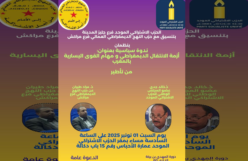 ينظم الحزب الاشتراكي الموحد فرع جليز المدينة، بتنسيق مع حزب النهج الديمقراطي العمالي فرع مراكش، ندوة سياسية بعنوان: “أزمة الانتقال الديمقراطي ومهام القوى اليسارية بالمغرب”، وذلك يوم السبت 1 نونبر 2025 على الساعة السادسة مساء، بمقر الحزب الاشتراكي الموحد الكائن بعمارة الأحباس باب دكالة بمراكش.