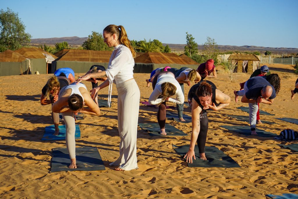 تتقدم لورا وكاتيا، وهما سائحتان ألمانيتان تقيمان بهذا المخيم المطل على التلال الرملية، في هدوء للالتحاق بمجموعة تضم حوالي عشرين من عشاق هذه الممارسة الروحية، قصد الاستمتاع بلحظات من الاسترخاء والهدوء وإعادة الاتصال بالذات.