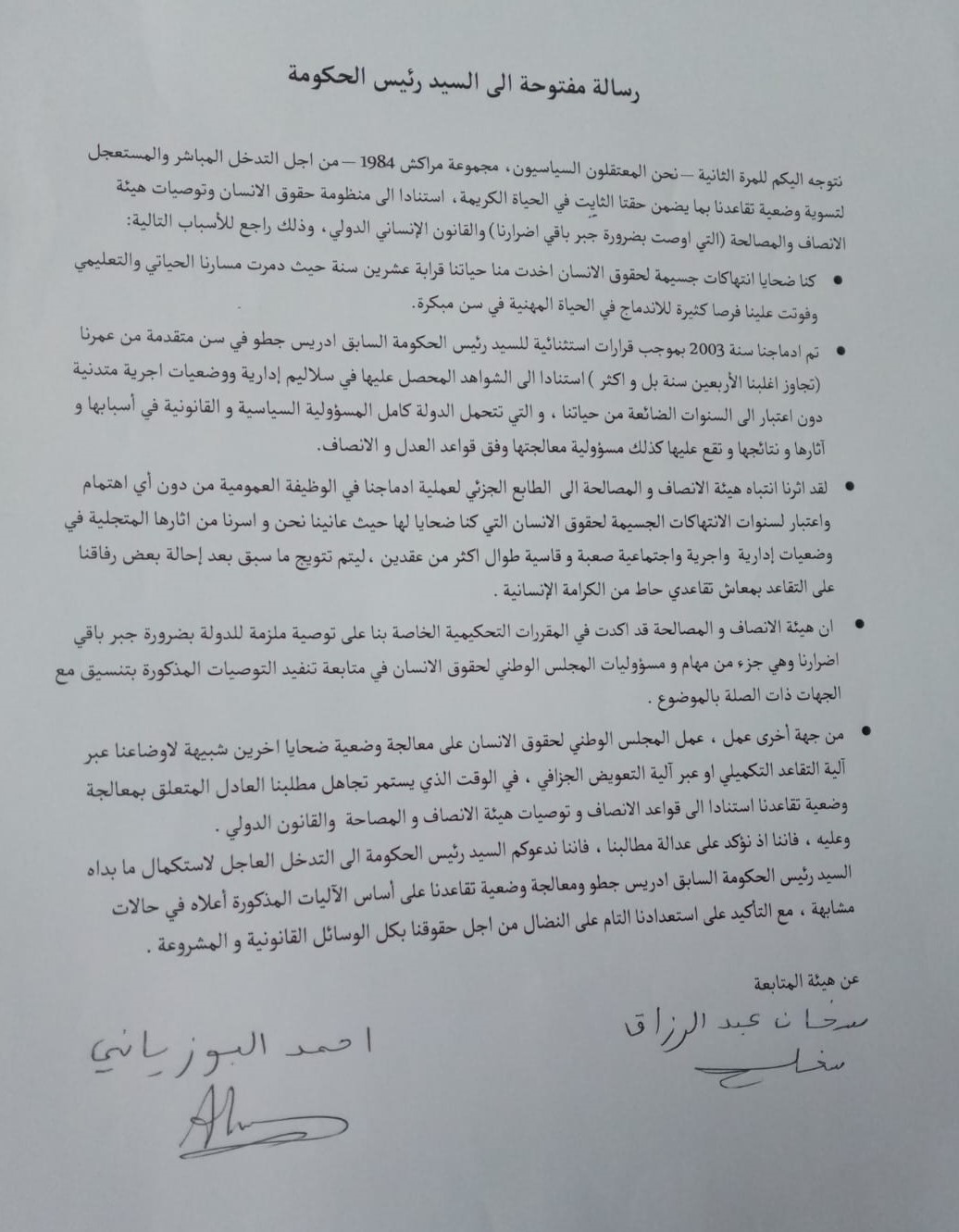 وجّه المعتقلون السياسيون السابقون، المعروفون بـ“مجموعة مراكش 1984”، رسالة مفتوحة إلى رئيس الحكومة، دعوا من خلالها إلى تدخل مباشر ومستعجل من أجل تسوية وضعية تقاعدهم، بما يضمن حقهم في العيش الكريم، انسجاما مع منظومة حقوق الإنسان وتوصيات هيئة الإنصاف والمصالحة.