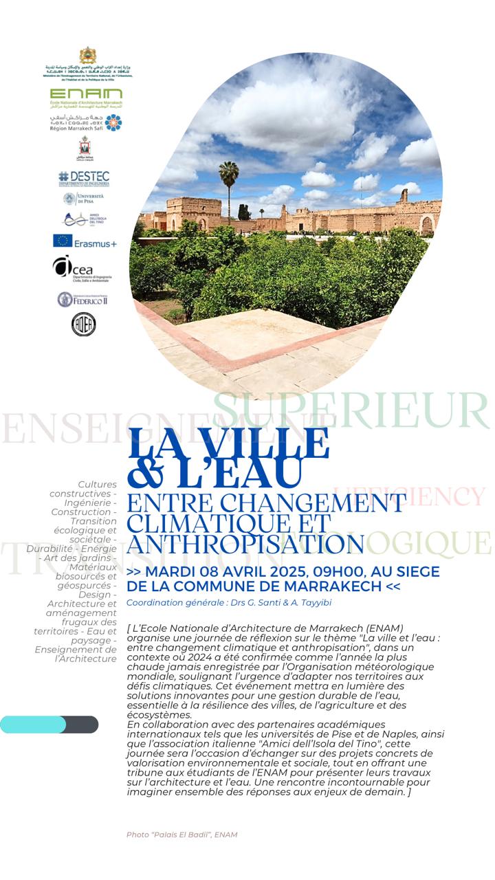 في سياق عالمي يتسم بتفاقم غير مسبوق لآثار التغير المناخي، تنظم المدرسة الوطنية للهندسة المعمارية بمراكش التابعة لوزارة إعداد التراب الوطني والتعمير والإسكان وسياسة المدينة، بشراكة مع عدد من المؤسسات الأكاديمية الوطنية والدولية الدولية، يوما دراسيا علميا تحت عنوان: «المدينة والماء: بين التغير المناخي والأنسنة»، بالقاعة الكبرى لقصر بلدية مراكش، وذلك يوم الثلاثاء 08 أبريل 2025، ابتداء من الساعة التاسعة صباحا.