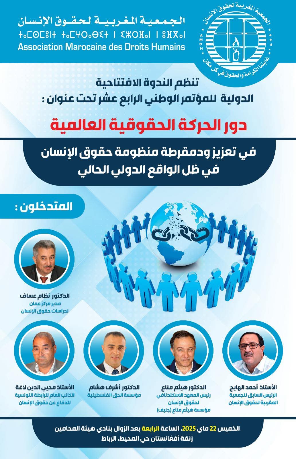في سياق تزايد التحديات الحقوقية على الصعيدين الوطني والدولي، تعقد الجمعية المغربية لحقوق الإنسان ندوة افتتاحية دولية، تندرج ضمن فعاليات مؤتمرها الوطني الرابع عشر، وذلك تحت عنوان: “دور الحركة الحقوقية العالمية في تعزيز ودمقرطة منظومة حقوق الإنسان في ظل الواقع الدولي الحالي”.