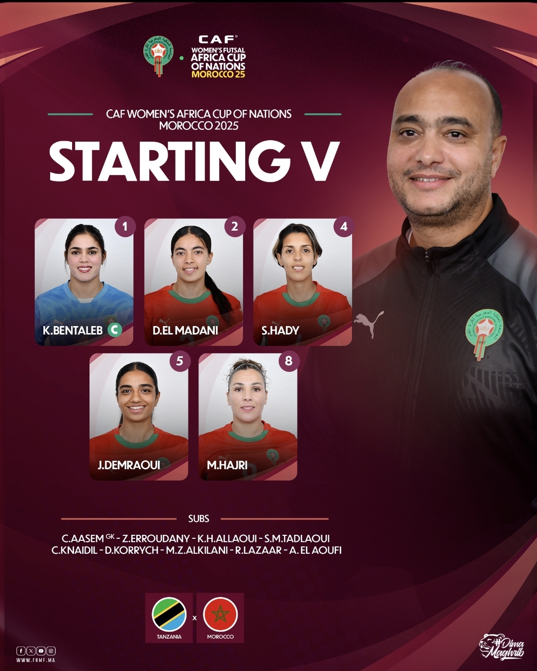 أعلن عادل السايح، مدرب المنتخب الوطني النسوي لكرة القدم داخل القاعة، عن التشكيلة الرسمية التي ستخوض المباراة النهائية لكأس إفريقيا للأمم، والتي ستجمع بين المنتخب المغربي ونظيره التنزاني مساء اليوم الأربعاء 30 أبريل 2025.