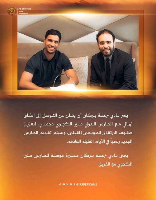 أعلن نادي نهضة بركان أنه توصل إلى اتفاق نهائي مع الحارس الدولي منير الكجوي محمدي، لتعزيز صفوف عاصمة البرتقال للموسمين المقبلين.