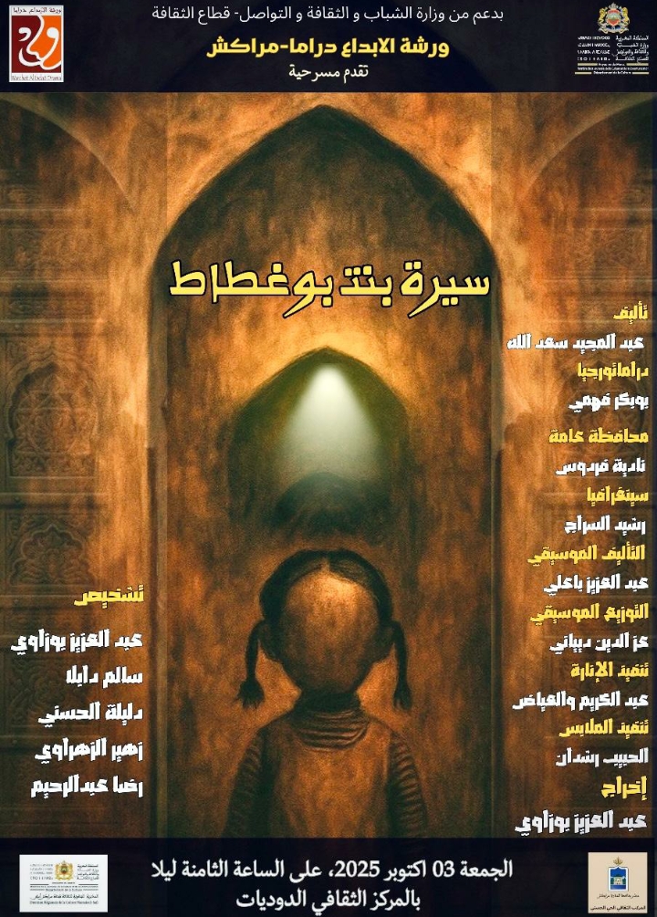 تستعد ورشة الإبداع دراما إلى تقديم عرضها المسرحي الجديد بعنوان “سيرة بنت بوعطاط”، وذلك يوم الجمعة 3 أكتوبر 2025 على الساعة الثامنة ليلا، بالمركز الثقافي الداوديات بمراكش.