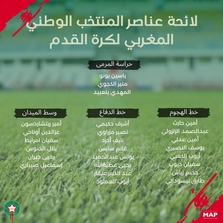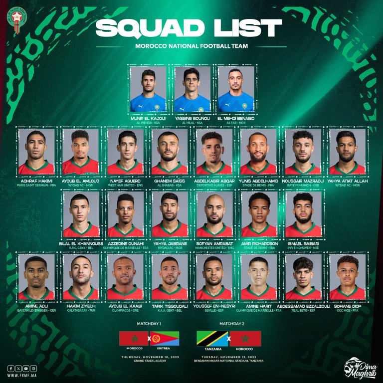 وجه وليد الركراكي، مدرب المنتخب الوطني الدعوة إلى 25 لاعبا للمشاركة في التجمع الإعدادي الذي ستخوضه النخبة الوطنية تحسبا للمباراتين اللتين ستجمعه بمنتخبي إريتريا وتنزانيا برسم الجولة الأولى والثانية (المجموعة الخامسة) من التصفيات الافريقية المؤهلة لنهائيات كأس العالم 2026.