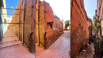 مسنود بأعمدة “فاعل خير”.. مواطنون يناشدون والي جهة مراكش لإنهاء خطر جدار آيل للسقوط
